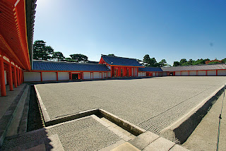 上の写真は承明門から紫宸殿を、下の写真は紫宸殿前の庭「南庭」で、正面の門が承明門。