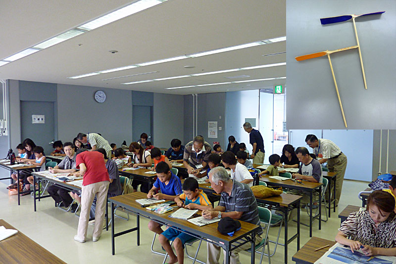 竹トンボを一から作るとなると随分時間もかかるので、半完成品(ほとんど完成品)を渡して、竹トンボの羽根(両方)の先だけをカッターで削り落として完成、あと竹トンボの中心の穴に串刺し棒を入れ接着剤で止めるという至って簡単なものである。が、幼児や小学校1~2年生が多く、これだけのことをするにしても結構時間がかかった。初めてナイフを使うという子どもも数人いたが、削るやり方を教えると、だんだんとうまくなり上手に使えるようになっていた。その後は外に出て竹トンボを飛ばしてキャーキャーと叫んで楽しく遊んでいた。 全員、参加して楽しかった。またこのような竹細工の教室を開いてほしいとの保護者からの要望が多くあった。次回は10月22日(土)、牛乳パックを使った4羽風車づくりの予定だ。