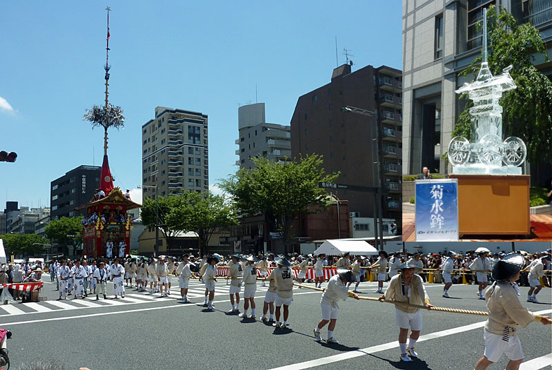 十数年振りに祇園祭のクライマックスとなる山鉾巡行見物に出かけた。京阪の祇園四条駅で下車、四条河原町に行こうとしてもすごい人、人で、仕方なく木屋町通りを北上し御池通りで見物。写真が御池通りを行く山鉾、右上の写真は京都ホテルオークラ前での氷で作った菊水鉾。