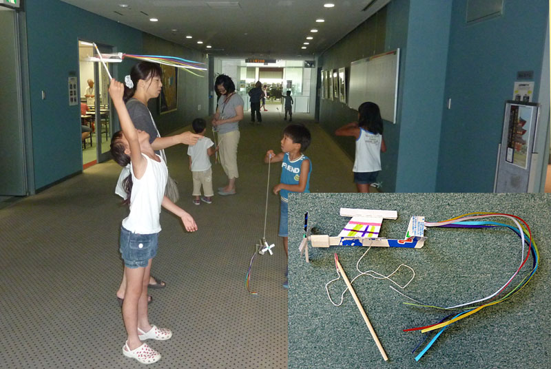 今回もラジオ放送「FMひらかた」から平上アナウンサー(女性)が来室し、実況中継された。子ども(2名)へのインタビューもあって、「きらら」(市立生涯学習情報プラザ)でのおもちゃ作りのPRも少しは出来たのではないか?と思う。 写真は会場を出て完成した飛行機をくるくると回して遊ぶ様子。