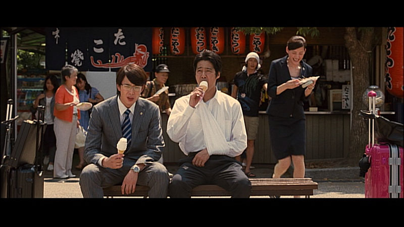 この記録的な猛暑の中、8月14日の大阪府庁、25日の大阪城前の「豊城園」(茶店)、26日の大阪城極楽橋、28日の大阪府庁、9月7日の京都東映撮影所での撮影にエキストラとして参加した。スクリーンに映ったのは、25日大阪城前の「豊城園」(茶店)で、会計監査の仕事も終わり3人(会計監査員の堤・岡田・綾瀬さん)が大阪城をみながらソフトクリーム、タコ焼きを食べるシーンで、3人の後の茶店左横の自動販売機から夫婦役で一緒に出て、しばらく立ち止まって話し合って横に出ていくシーン。(写真のシーン、手ぬぐいを被っているのはタコ焼き屋の兄ちゃんこと玉木宏さん) また、同じく大阪城をみながらタコ焼きを食べる鳥居会計監査員(綾瀬さん)の後の同じ茶店左横の自動販売機から出て、まっすぐ出ていくシーンも少しであるが映っていた。