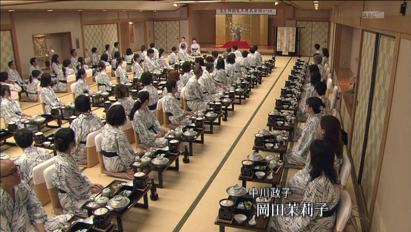 7月10日、雄琴温泉、浪漫あふれる水都の宿「びわ湖花街道」で、約60名が参加した宴会で大・若女将のあいさつの撮影が行われた。前から撮影が行われると思って前に(画面左3列の前2番目)座ったが、後ろから撮影が行われて女将のあいさつがが終わったら終わりだった。何かあっけない撮影だったので、そのシーンはどこで出てくるのかとみていたら事件が解決した最後の宴会シーン。女将があいさつするシーンを後からズームアップで最後まで頭と少し横顔が映っていたが、少しガッカリ・・・・・。