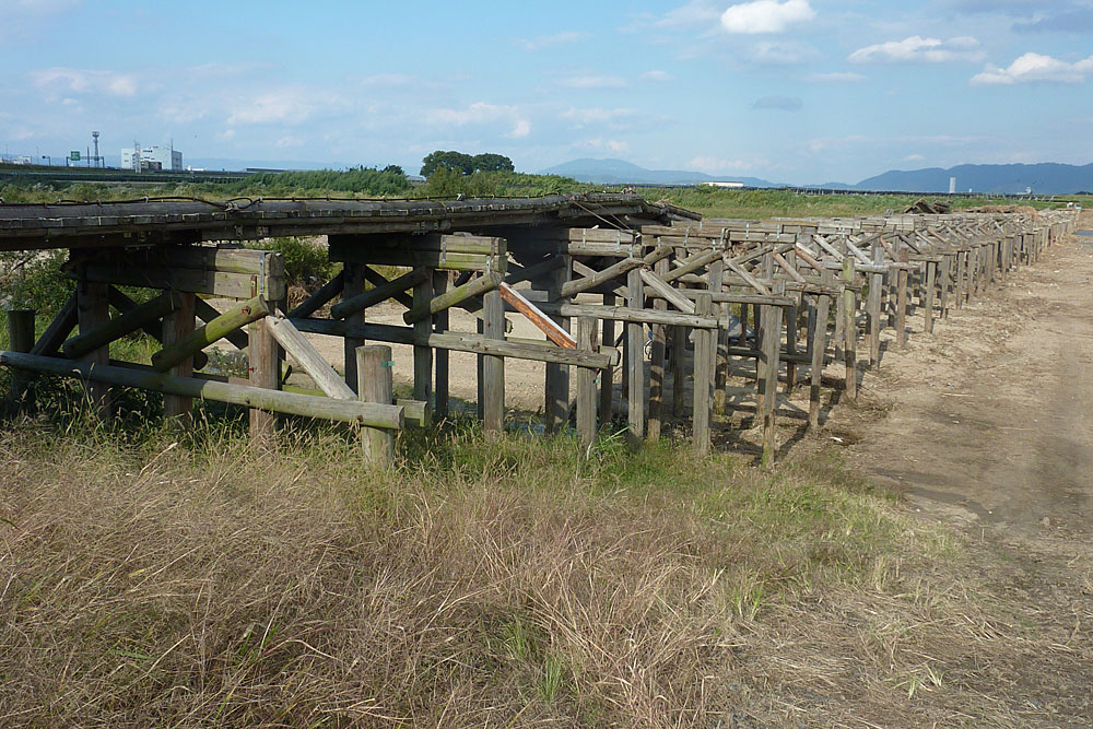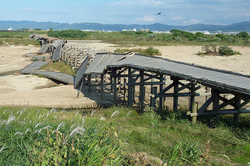 木津川に架かる八幡市と久御山町を結ぶ上津屋橋の通称・ながれ橋。昨年に引き続き非常に強い台風17号(9月30日)の影響で橋が流されたとの知人のブログで知り見に出かけた。ほんまに流れている!!(@_@;) このような橋をみたのは初めてだ。この橋は、全長約356.5mあり現存する最長級の木橋で、昭和26年に架けられた。当時永久橋を架ける予算がなく、かといって普通の木造橋では増水の度に流されてしまう。そこで水の流れに逆らわない構造の橋が架けられた。つまり、木津川が増水して橋板まで水に浸かると橋板が自然に浮かび、八つに分割してワイヤーで繋がれた橋板が吹き流しのように流れる「流れ橋」。水が引けばワイヤーを引っ張り橋板をたぐり寄せ元にもどすというもの。だが、大変な作業で費用もすごくかかるなぁ~。