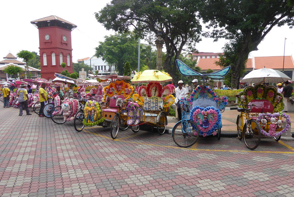 マラッカ名物、サイドカー仕様の人力車「トライショー」が面白かった。カラフルで独自の飾りつけをしている。排気ガスを排出しない究極のエコロジーカーで、観光名所を巡る移動手段として珍重されている。料金メーターはついていないので運賃は交渉制だ。(下の写真)