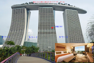 この5つ星ホテルは、3つのタワーがあり、その上に船の格好をした地上200Mのスカイパークと全長150メートルの美しい屋外インフィニティプールがある。この高さでは世界最大の広さで、5つ星ホテルが誇れるものの一つ。男性ガイドの話によれば、世界でも最も収益がある超人気のホテルだそうだ。(2010年開業)