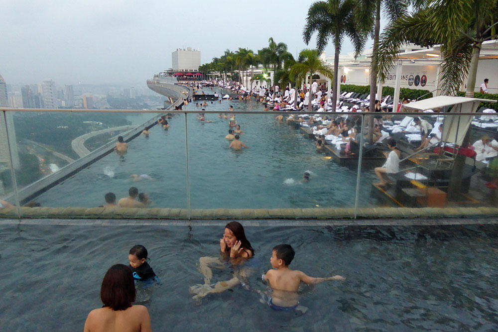 スカイパークとインフィニティプールの利用は宿泊客のみで、朝6時から夜12時まで、部屋で水着・ガウンを着て(普段着でもOK)でドアーの個人カードを提示すればいつでも利用できる。バスタオルも用意されているので持っていく必要がない。いつも多くの宿泊客で賑わっていた。プールには夕方に見物し、夜に行って泳いでみた。深さは胸のあたりで、プールに入っての風景、特に夜景が非常に素晴らしかった。