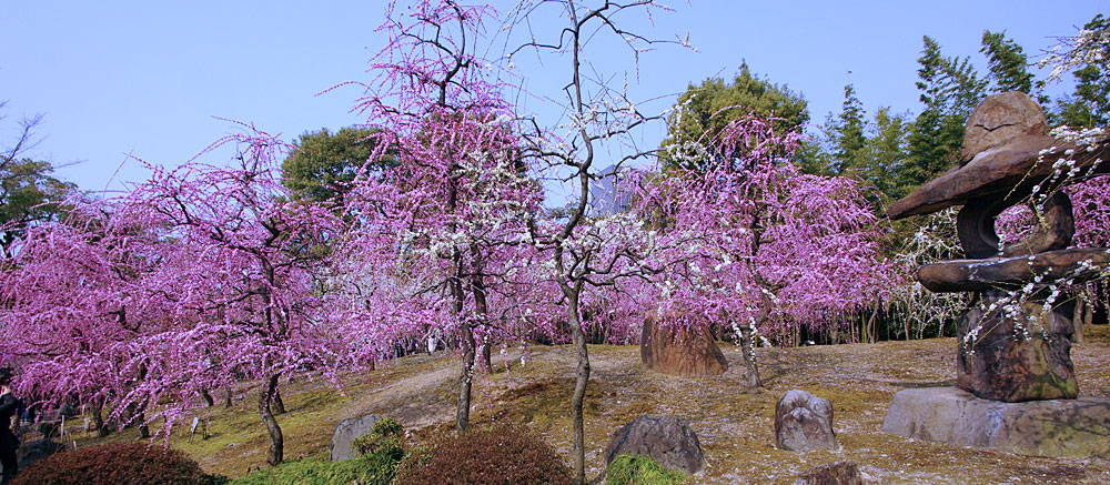 今回、神苑で満開を迎えた約150本のしだれ梅にはピンクや白い花が咲きほのかな甘い香りが漂い、楽しませてくれた。今年は例年より約2週間早く見頃を迎えてているとのことらしい。奇しくも朝日新聞夕刊に、このしだれ梅の写真が掲載された。