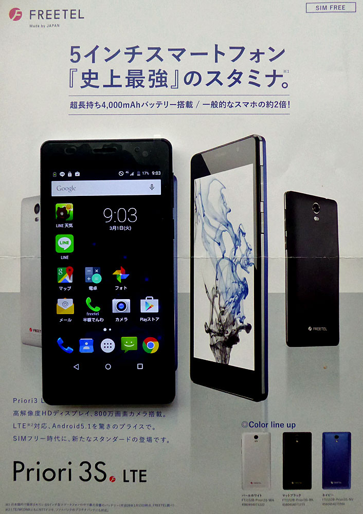 昨年8月に格安スマホ(FreeTel Priori2+FreelTelのSIM・使った分だけの支払い)を購入して約半年も過ぎ操作・使い方などもわかってきたこと、また今回、新製品Priori3Sが発売され、新規にFreeTelのSIMと併せて購入すと、1年間は1GB容量が無料とのキャンペンがされていることもあった。