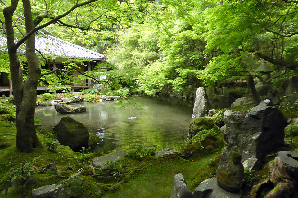 八瀬比叡山口駅より徒歩約10分にある天台宗の寺院「蓮華寺」をはじめて訪れた。ここも新緑が美しく、心和らぐよい庭園があり楽しませてくれた。やはり秋がよいと思うので、また訪れたい。ここは創建年代についてははっきりしないが、もとは洛中に営まれていた時宗の寺で、応仁・文明の乱(1467~1477年)の乱以後荒廃していたものを、加賀藩の家老であった今枝近義が祖父・重直の菩提を弔うために現在地に再興しましたという。今枝重直は織田信長や豊臣秀次に仕え、勲功により豊臣の姓を許されるほどの人物で、秀次の死後は前田利家に仕えた後、隠退して宗二居士と名乗り、茶の湯をたしなむなど、余生を風流人として過ごしたとのこと。