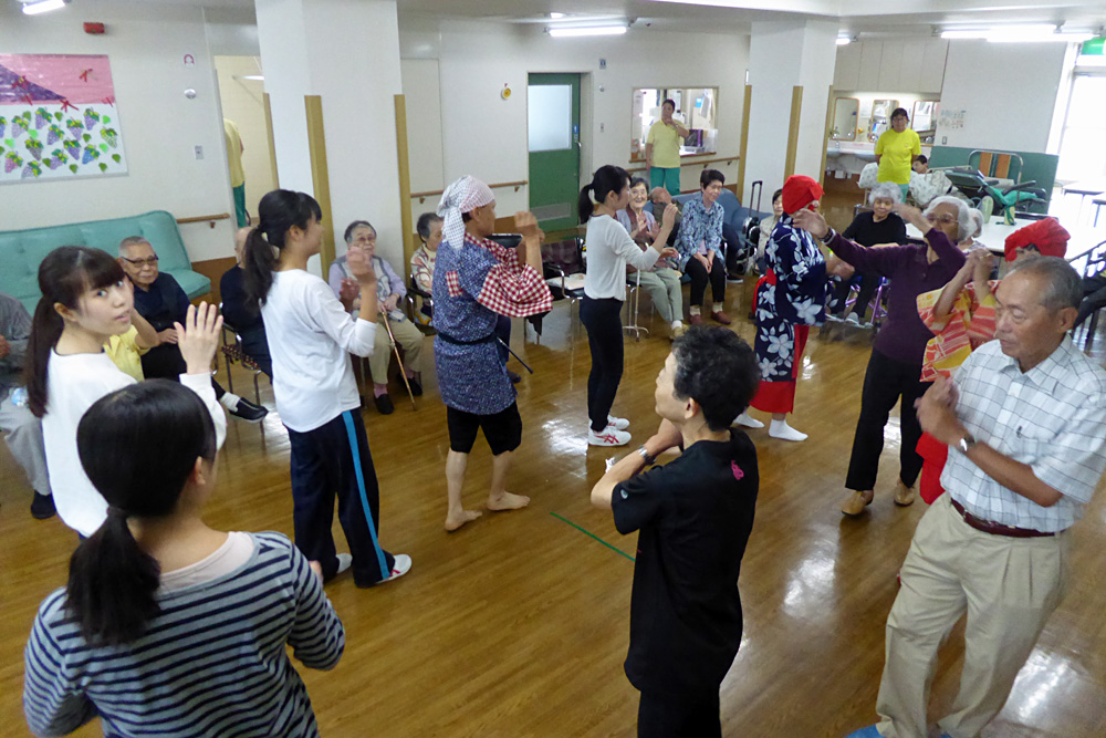 出し物は、いつもの歌体操(4曲)→舞踊(2曲)→踊り「どじょうすくい」→皿まわしと南京玉すだれ→童謡唱歌→踊り「おてもやん」(おてもやん民謡)、時間が少しあり最後に「炭坑節」の踊りを対象者(ディーサービス者、職員、関西外大実習生含む)も一緒に踊った。
