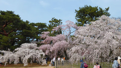 高校クラス会(29日)で「仙洞御所」を参観に伴う下見を兼ねて京都御苑を訪れた。京都御苑北西部のに五摂家の一つ、摂政や関白を多く出した近衞家の邸宅跡で、枝垂れ桜の大木が約60本植わっていて見頃を迎えていた。ほぼ毎年、この近衞家の邸宅跡の桜を見に来ているが、今回も多くの市民や外人観光客などで大賑わいだった。ここは御苑で一番早く咲き始める桜で、3月中旬にはほころび始める。この近衛邸跡の庭園に塀や建物はないが、大きな池を囲むように庭園は保存されて、その池は、同じ御苑内の堺町御門近くの九条家の九条池に対し近衛池とよばれている。また、御苑内には所々にしだれ桜、ソメイヨシノ、山桜なども満開で楽しむことができた。
