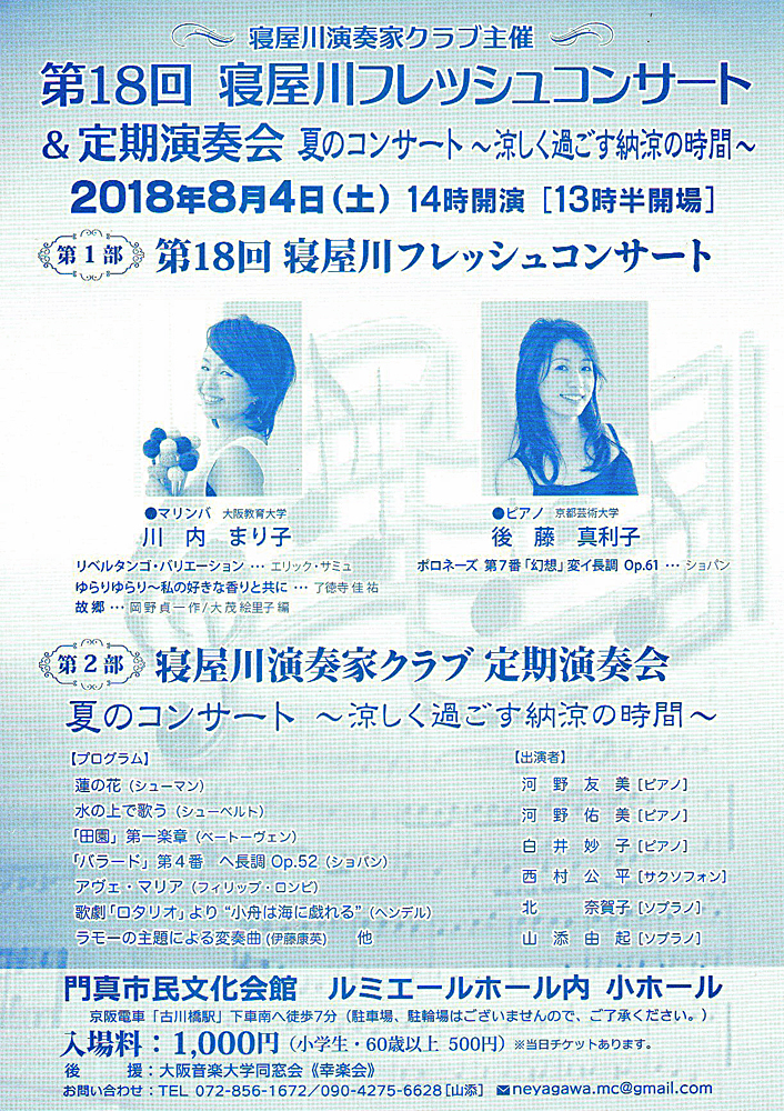 寝屋川演奏家クラブ」の第18回「寝屋川フレッシュコンサート&定期演奏会、真夏のコンサート~涼しく過ごす納涼の時間~」が8月4日、門真市民文化会館ルミエールの小ホールであり聴きに出かけた。