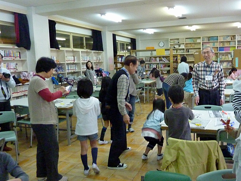 今回も教室だったので、ゆっくりと出来た。子ども達は、廊下や運動場に出て4枚羽の風車を走って回したり、トンボを飛ばしたりしてワイワイと言いながら皆と一緒に遊んでいた。