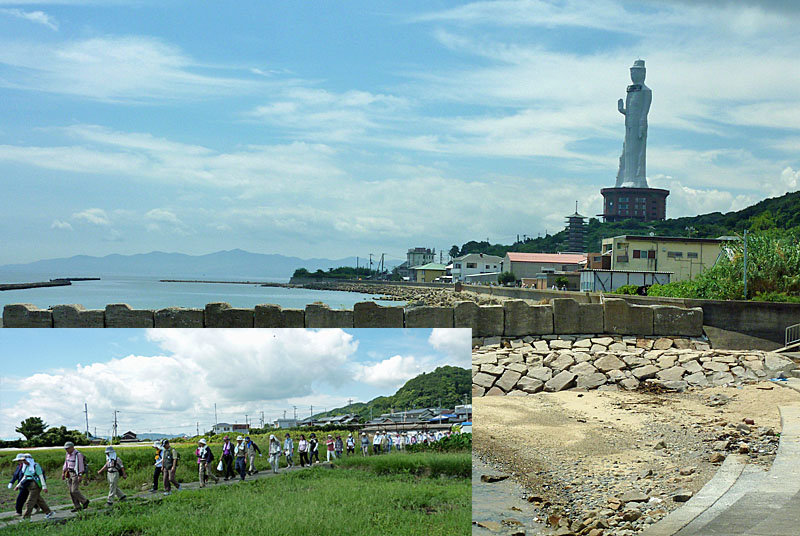 | 世界平和大観音像(閉鎖)と付近をウオークする参加者 |