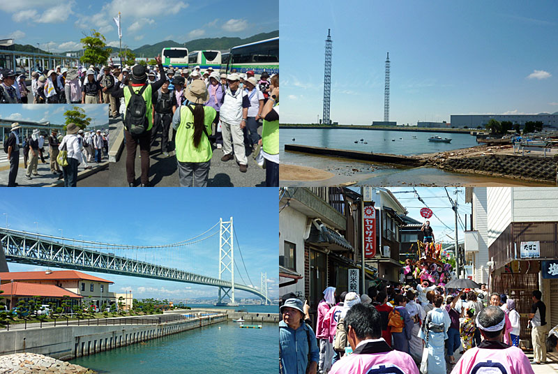 | 左上スタート点での説明、上ラジオ電波塔、 左下明石大橋、下岩屋神社の秋祭り |