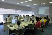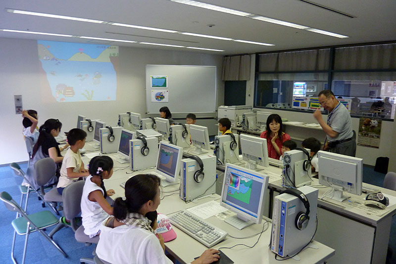 きらら(枚方市立「生涯学習情報プラザ」)で子どもたちの春・夏・冬休みに「子どもの楽しいパソコン教室」を実施しいるが、今年の夏休みも『動物アニメーションづくり』と『カード・カレンダーづくり』を実施。その中の『動物アニメーションづくり』を27日~28日(午前10時から12時)に行ない、28日のみアシスタントをつとめた。参加者は予約した子どもが急きょ2名不参加となり、参加している妹(3歳)・母親の2組が参加して何とか10名となった。今回、小学3年生の参加が5名であったために父兄(5名)の同伴があった。今回もスズキ教育出版社の子ども用総合ソフト「キューブきっず」を使って、夏ということでカメに乗った浦島太郎の違う絵を2枚、タコやカメもそれぞれ違う絵を2枚作成して、それを電子かみしばいで組み立て(スピードや動き方を設定)て、動かすもの。子ども達はパソコン画面上で設定した通りに動くので大変喜んでいた。写真はその教室の様子。2012年7月22日日曜日