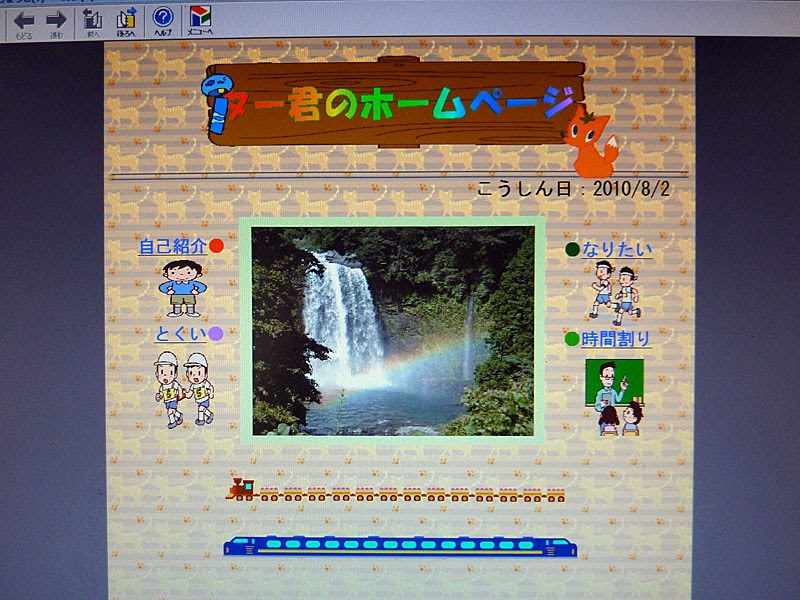 写真は講師が一緒に説明しながら作成した「ター君のホームページ」のトップページで、これ以外に「自己紹介」「とくい」「なりたいこと」「時間割り」の4ページを作った。当然子どもたちは、独自のホームページを作成し、それをサーバーにアップロードしインターネットで閲覧できるようにした。 自宅や祖父母宅などから見られるので大変喜ばれた。