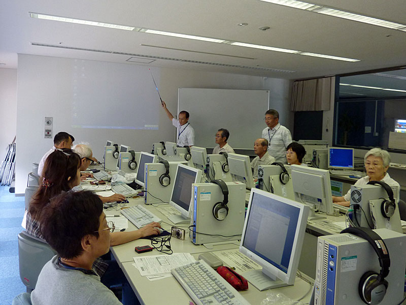ナルク「天の川クラブ」が枚方市から「生涯学習情報プラザ」の運営委託を受け、この4月で丁度3年が経過し、今年度も継続されることとなった。ここでの特徴は、平日朝9時から夜の9時まで(日曜祭日は5時まで、休館日は毎月第4火曜)、設置されているパソコン(計22台)が自由に使え、解らないことがあれば教えてもらえること。それと2年半前からスタートしたミニ体験(入門編・Word編・Excel編、インターネット編の2時間の体験コース、定員10名で日・月曜日以外の午前に実施)が無料で受けられることである。 ここは市民がパソコンを勉強するための教育センター的になっている。このミニ体験の受講者も約3400名にもなり、大変好評で市民のパソコン使用(活用)向上に大きく貢献しているかなぁ~?と思う。このミニ体験のテキスト作成もすべて担当し、その講師も時々行っている。本日、月例会があり2つの追加講座が決まった。1つは入門編とWaordの中間的な内容のものと夏休みに子供対象の「パソコン教室」をしようということになった。 また、テキストを作成することとなり、特に子供に対する講座内容をどうするのかが今後の課題だ。(写真はミニ体験中の様子、クリックすると拡大表示されます)