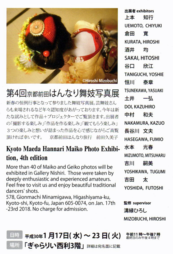 石瓶小路にあるDu-Ran(石塀小路 デュラン)で「舞妓写真展」(22日~31日)が行わているので訪ねてみた。舞妓さんの写真が喫茶店内に30数点掲載されていて、綺麗な舞妓さんの見応えのある優れた作品だった。この「石塀小路」が出来たのは比較的最近のことで、大正時代の初期頃。「石塀小路」の土地は、当初は圓徳院の所有地であったが、明治時代になって税金を納める必要が出てきたため、圓徳院庭園の一部を取り崩して、通り抜けの道を造ったことから始まる。現在のような姿に完成したのは、昭和になって京都から市電が廃止されるようになって、市電に使われていた石畳をここに敷いたことからとのこと。「石塀小路」が出来た頃には現在のように旅館や飲み屋はなかったが、東山を舞台とした映画ロケが盛んにされた頃から、映画関係者を目当てとした旅館や飲食店などが建ち並び、現在のような姿になったとのこと。