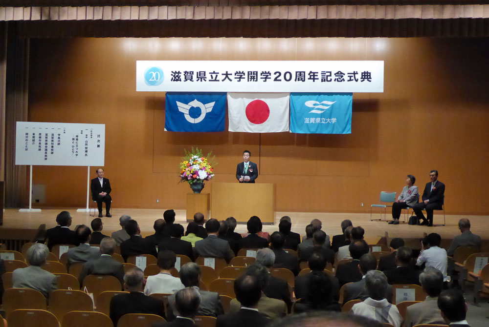 2)県立大学開学20周年記念式典(13:00~14:00)が交流センターにて行われ、記念講演:山折哲雄先生に続き、記念式典が14:15~14:45まであり学長式辞、三日月滋賀県知事、西村県会議長、大久保彦根市長の式辞があった。