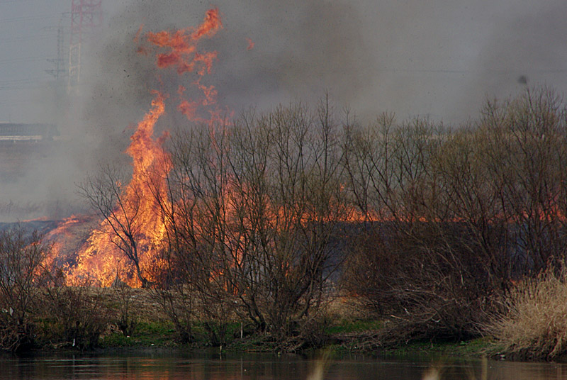 淀川(高槻市側)に春の訪れを告げる「鵜殿のヨシ原焼き」が、9時から正午にかけて行われたので、写真を撮りに出かけた。これは伝統行事・文化の継承と市街地に残された貴重な自然の保護・保全のために、高槻市上牧町から道鵜町の淀川河川敷一帯で、地元の実行組合などが中心となって行われるもの。