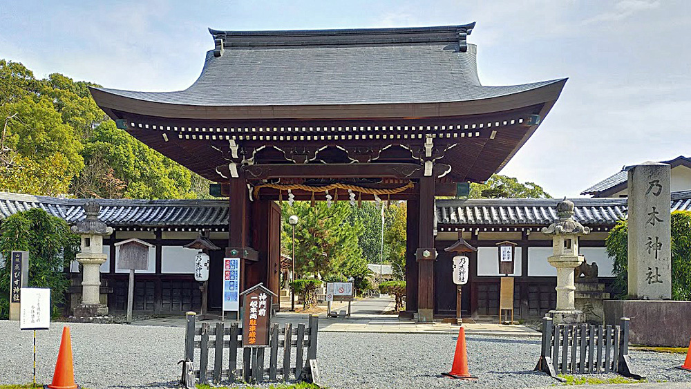 ここ京都伏見桃山に乃木神社が建てられたのは、明治天皇の崩御に際して乃木大将が遂げた「殉死」の一事にある。明治の御維新以来、国運の進行を図らせたまわれた明治天皇は、明治45年7月30日、遂に崩御あそばされた。御陵は「朕が百年の後は必ず陵を伏見に営むべし」との御遺志により、伏見桃山の地と定められた。明治から大正へと元号が改められた9月13日、国民の深い悲しみの中、東京青山葬場殿にて御大喪の儀が行われた。天皇の霊柩が御轜車に移され、皇居から斎場に向けいよいよ車列の出発を告げる号砲が鳴り響いたまさにその刻に、軍事参議官兼学習院長陸軍大将従二位勲一等伯爵乃木希典は、妻靜子とともに赤坂の屋敷にて皇居に正対端座し自刃された。