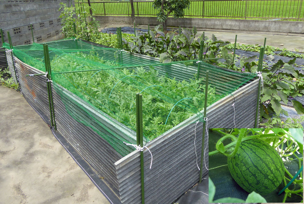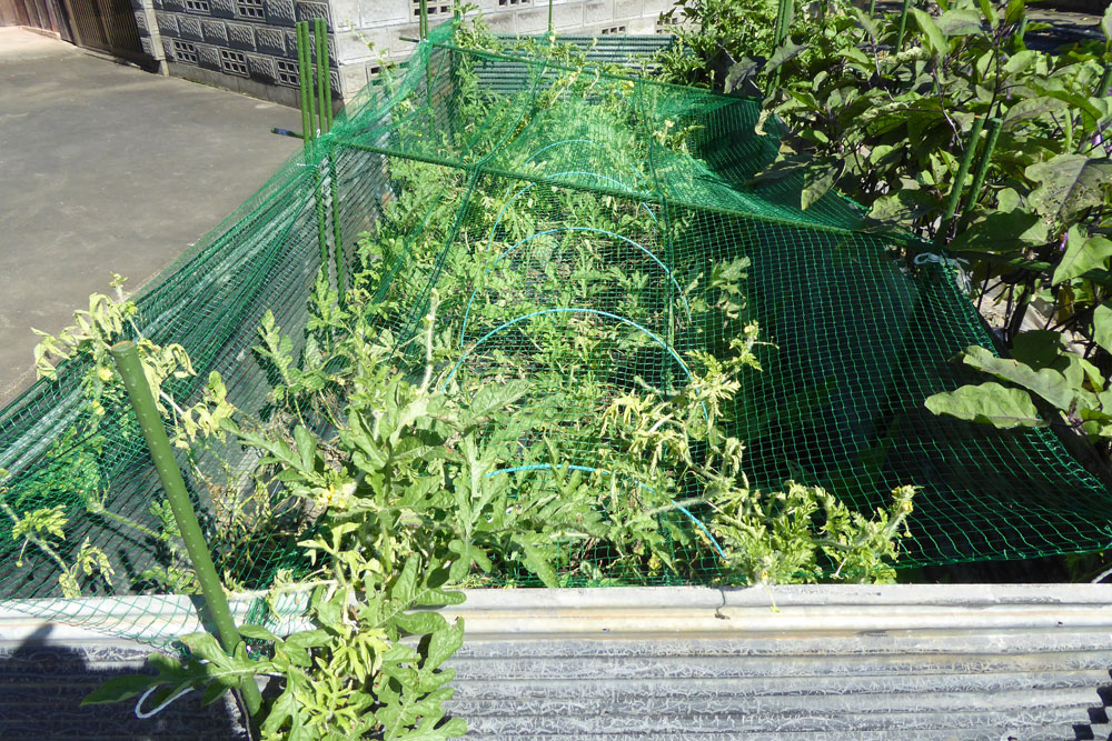 そこで、どうしたものかと思案して、とりあえず写真上のように網を買ってきて囲ってみた。また、スイカも周辺をトタンで囲み、上には網をかぶせてカラス対策もするつもりでやってみた。が、果たして効果はどうだろうか。