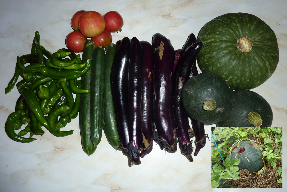 今年も5月6日に植えた夏野菜のキュウリ4本、満願とうがらし5本、長ナス5本、トマト4本、黒スイカ3本、カボチャ7本、ミニ冬瓜2本も7月中旬からキュウリの収穫から始まり、今も続いている。キュウリは毎年同じような収穫、満願とうがらしと長ナスは初めて品種を替えてみたが大豊作、カボチャも毎年あまりとれなかったが今年は豊作、トマトもミニ冬瓜もそれなりにとれている。 今年、残念なことに黒スイカ(5個)がカラスに全部やられたこと。昨年も植えたがカラスの被害に遭わなかったので、大丈夫と安心していたのがダメで、どうも今年のカラスは賢い? そのため遅きに期した感があるが、まだ2個ほど実がついているので防鳥ネットで覆った。1個でもとれたらよいのにとの思いで・・・・・。 写真は収穫した夏野菜のほんの一部とカラスにツツカレタ無残な黒スイカ。2013年5月26日日曜日