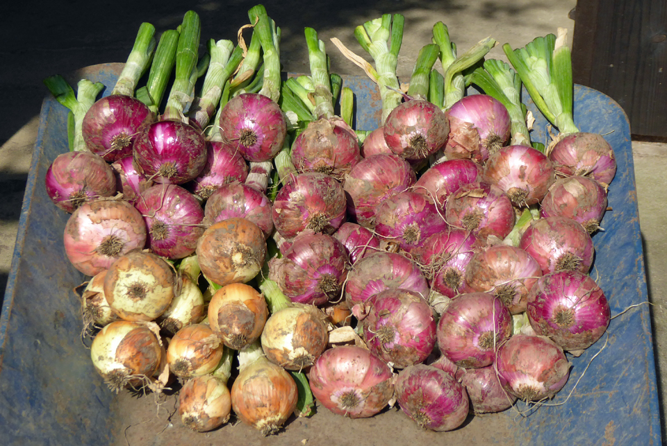 今年の玉ねぎも昨年と同様にほぼ満足のいくものだった。1週間後にはサツマイモを植える予定。写真は赤い玉ねぎを収穫した様子。